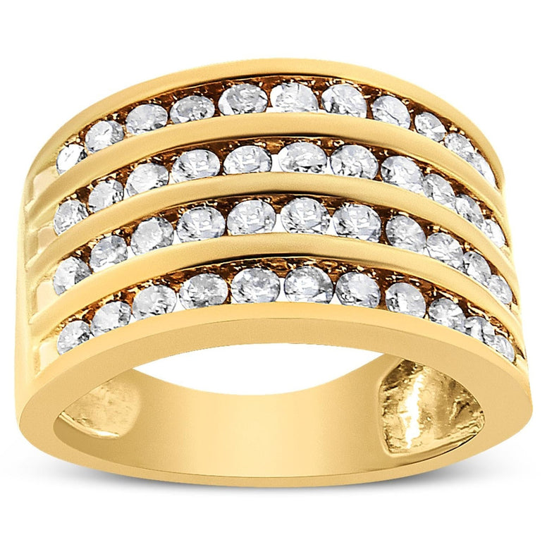 A perfect addition to your everlasting jewelry collection, this 4 row band is crafted in genuine .925 sterling silver and plated with 10k yellow gold, a metal that will stay tarnish free for years to come. Boasting an impressive total carat weight of 1 1/2 c.t., this ring has 4 rows of brilliant, round-cut diamonds in a unique channel setting. Add a touch of sparkle to your formal wear with this beautiful ring!