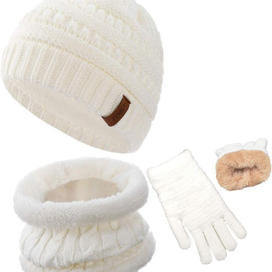 Knit thick and durable; Soft fleece-lined warmth; Includes beanie, scarf, and gloves