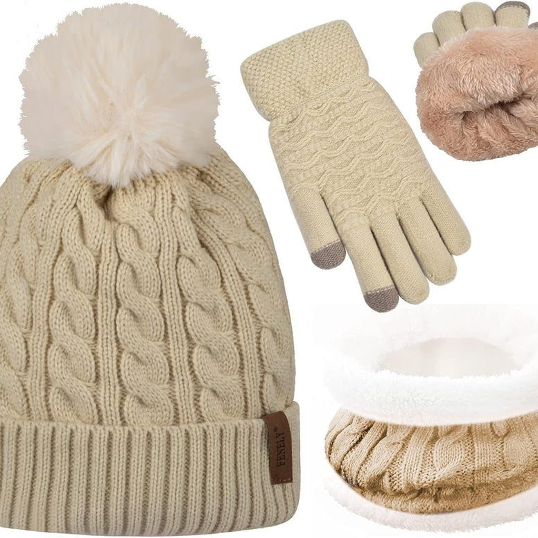 3Pcs Winter Women Beanie Hat Scarf and Touch Screen Gloves Sets Girls Classic Knit Warm Chunky Fleece Lined Cable Cap — Cozy all-in-one winter set.
