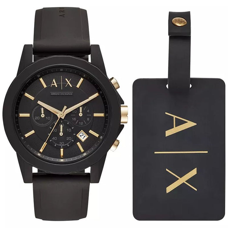 Matte black dial with gold-tone accents; 45mm black ion-plated case; Water-resistant to 50m, gift set includes Outerbanks watch and A|X luggage tag