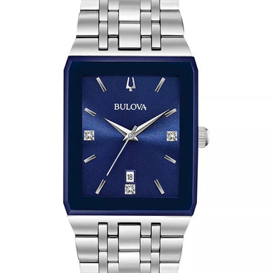 Diamond-accents on blue dial; 31x45mm rectangular stainless steel case; three-hand quartz movement