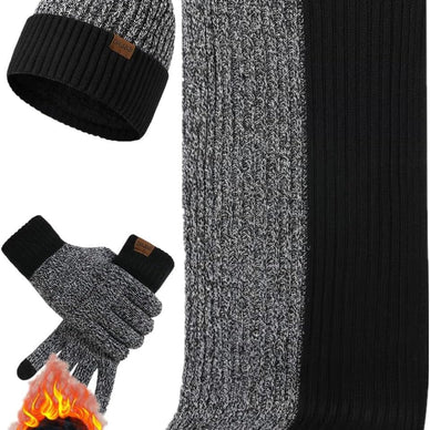 3-piece knitted set; touchscreen-friendly gloves; rib-knit warmth and flexible fit.