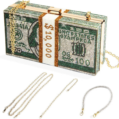Money Clutch Purses for Women: Stack of Cash Crystal Clutch Purses in Green — shine with hand-set rhinestones.