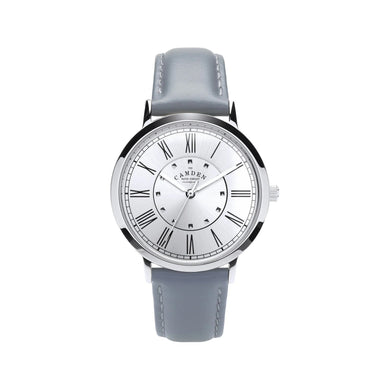 Stainless steel case with 37 mm diameter; refined slim Roman numerals; grey leather strap with triangular rivet-inspired studs
