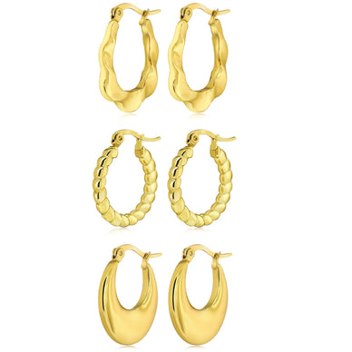 Twisted Hoop Earrings Set, Yellow Gold Plated, Hypoallergenic, 3 Pairs — Timeless shimmer for sensitive skin.